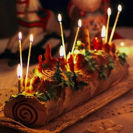 Церемониальному йольскому полену отводилось главное место в празднике. В соответствии с традицией полено должно быть взято с земли владельца дома или принято в подарок, но ни в коем случае не куплено. Принесённое в дом и установленное в камине, оно украшалось сезонной зеленью, поливалось сидром или элем и посыпалось мукой. Полено горело всю ночь (его поджигали от кусочка дерева прошлогоднего полена, которое специально сохранялось), затем тлело следующие 12 дней, а после церемониально вынималось. Ясень — традиционное дерево для йольского полена. Это священное дерево тевтонцев, ассоциируемое с мифическим древом Иггдрасиль.