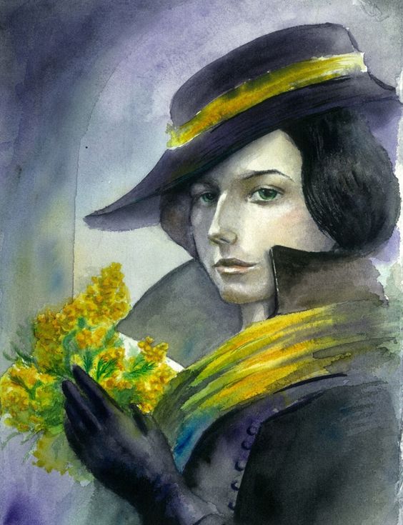 Реквизит: желтые цветы, шляпка, черное пальто