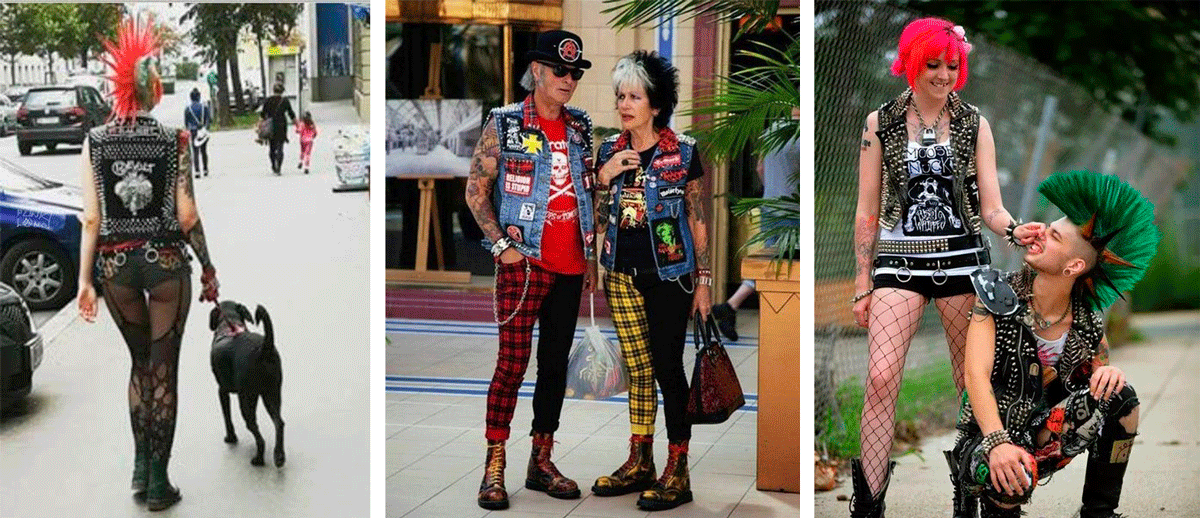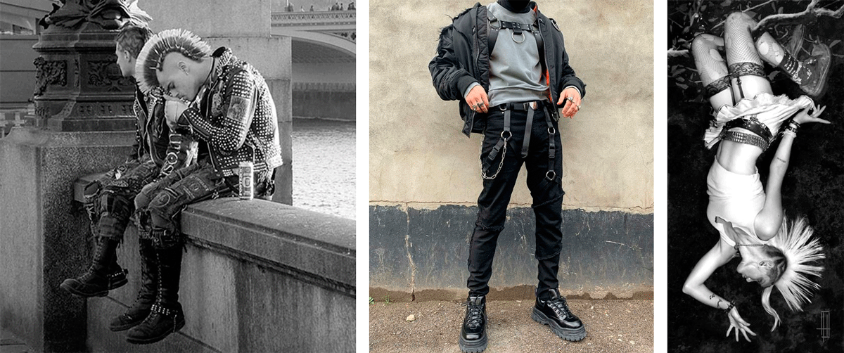 В моде рваная одежда, цепи и бесконечные клепки, кожаные куртки и тяжелая обувь.
