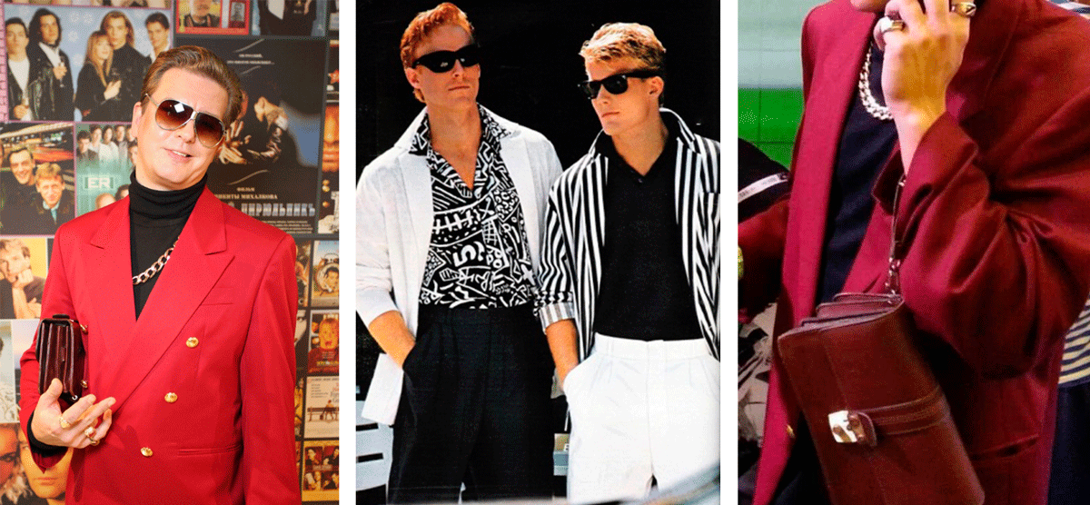 - Малиновые пиджаки и стразы (можно ослепнуть от лоска и блеска).